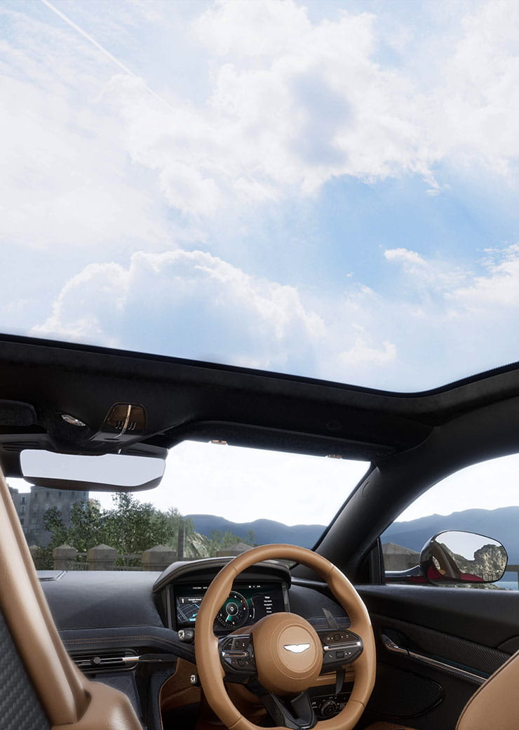 Kabina muśnięta światłem. Panoramiczny dach DB12, laminowany i wzmocniony, przepuszcza jedynie 6% promieni słonecznych, subtelnie rozświetlając wnętrze bez nadmiaru ciepła. Płynnie zintegrowany w jednolitą taflę szkła, otwiera niebo nad Tobą, by każda podróż miała królewską oprawę.