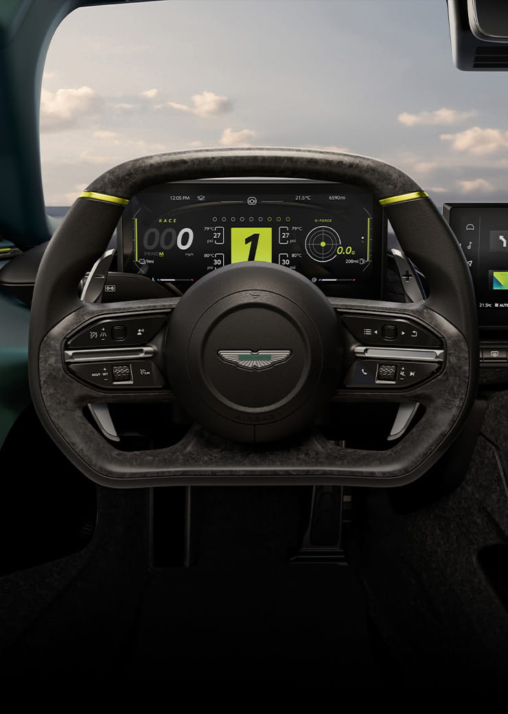 Pozycja za kierownicą Valhalli, z uniesioną piętą, czerpie inspirację prosto z Formuły 1®. Tak samo jak grafika wyświetlaczy po aktywowaniu trybu Race. Kierowca siedzi nisko – emocje sięgają zenitu. Podniesione podnóżki tworzą bardziej kierunkową, wyścigową pozycję z idealnym przełożeniem biodro–pięta. Siedziska z włókna węglowego – tworzone na zamówienie, doskonale wyprofilowane. W połączeniu z innymi rozwiązaniami inspirowanymi F1®, kokpit przybiera czystą, minimalistyczną formę – ergonomię skupioną wyłącznie na kierowcy.