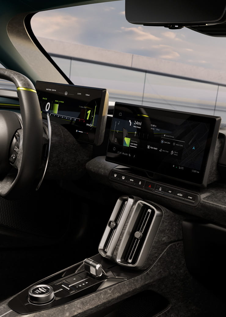 W Valhalli zastosowano najnowszą generację systemu infotainment Aston Martina. Przed oczami kierowcy znajduje się 10-calowy zestaw wskaźników zamontowany na kolumnie kierownicy, uzupełniony o szeroki centralny ekran dotykowy. Układ zapewnia pełną elastyczność – od wyświetlania danych torowych, przez nawigację, po aplikacje multimedialne. Kluczowa przejrzystość – system Full Digital Display Mirror (FDM) zastępuje tradycyjne lusterko wsteczne, oferując nieprzerwany, krystaliczny widok tego, co dzieje się za Valhallą.