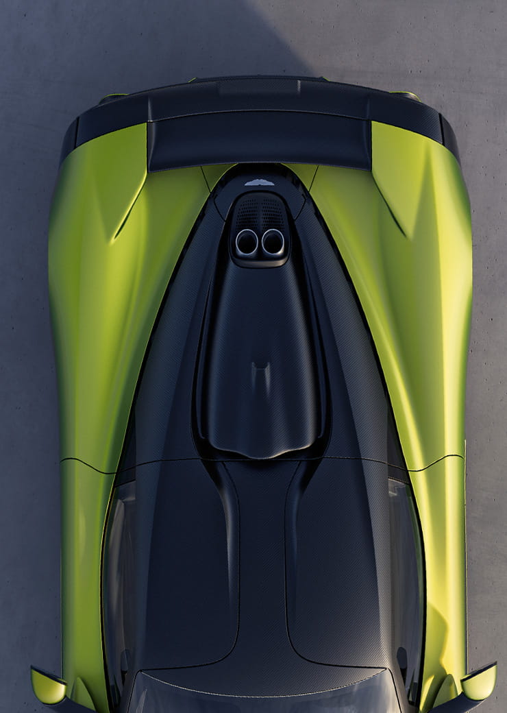 Przełomowa konstrukcja Valhalli prezentuje wlot dachowy inspirowany Formułą 1®, w którym doskonała forma spotyka się z perfekcyjną funkcją. Zintegrowany kanał w obniżonej linii dachu kieruje powietrze do trzech kluczowych systemów: turbosprężarek, chłodnic ACAC oraz bezpośrednio do gorącego układu ‘V’ silnika V8. Po obu stronach efektownego wlotu znajdują się rzeźbione, aerodynamiczne klapki serwisowe – skrywające wlewy paliwa i port ładowania.